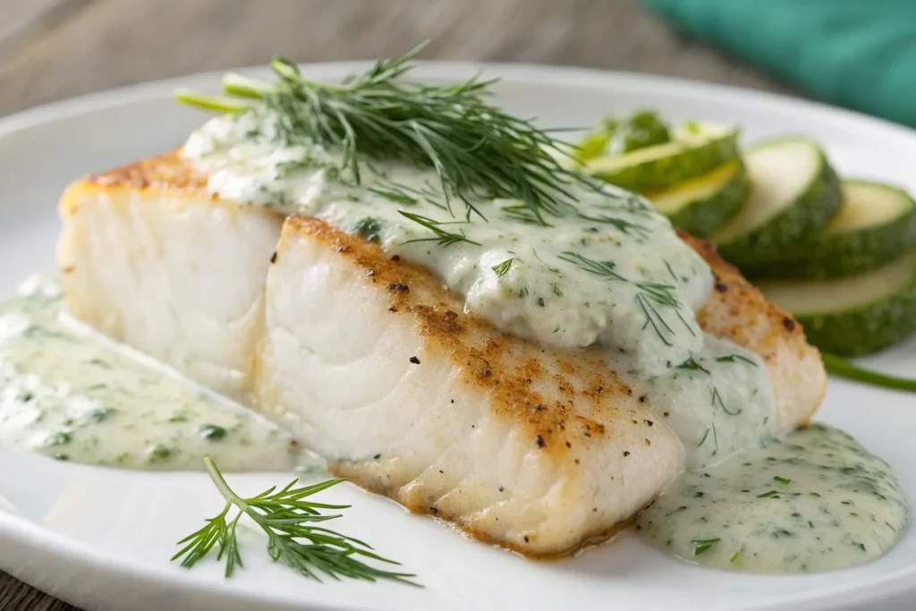3. Oven-Baked Halibut with Dill Yogurt Sauce