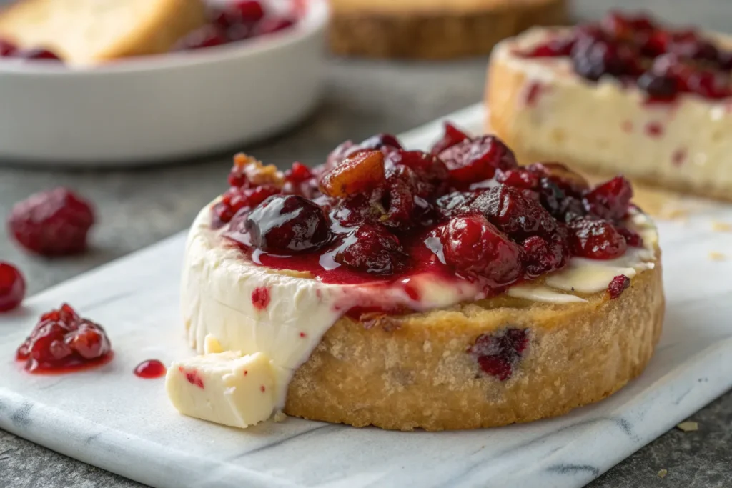 - Add one cube of brie and a teaspoon of cranberry sauce to each.