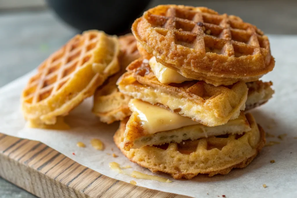- Layer ham, cheese, and a spoonful of scrambled egg between two waffles.