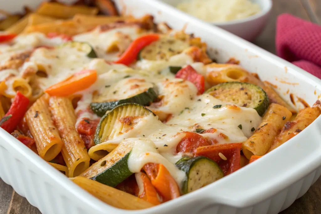 Layer roasted zucchini, bell peppers, and mushrooms with marinara, ricotta, and mozzarella. Bake until bubbling and golden.