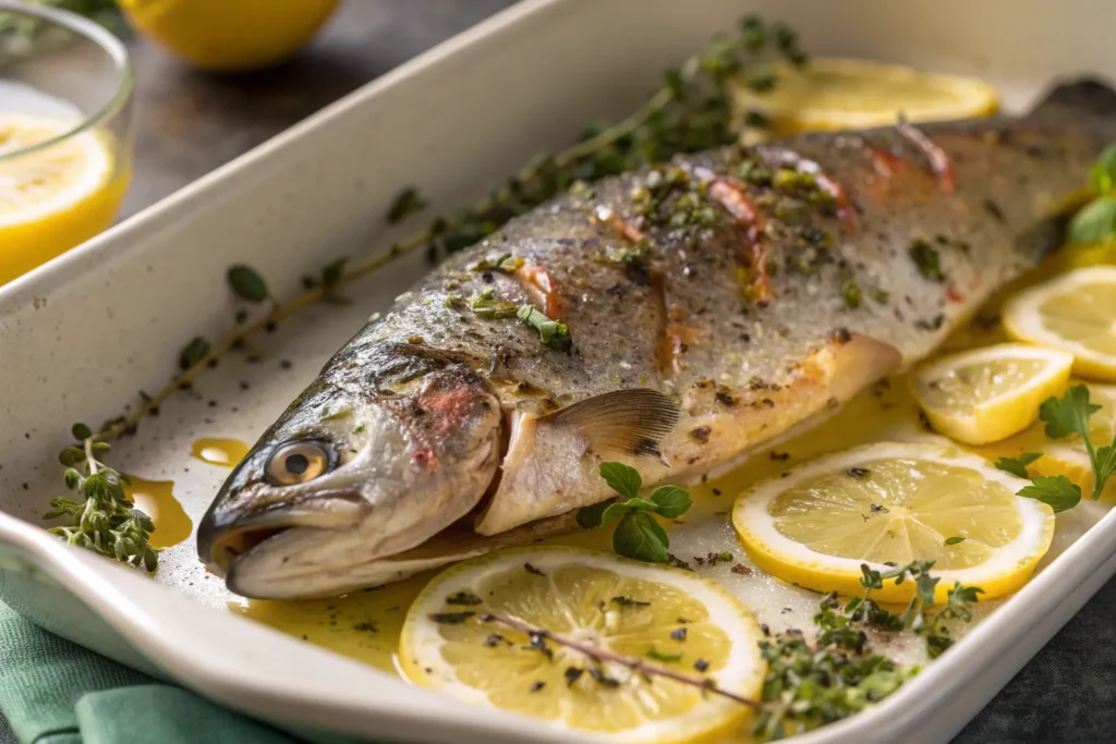 Whole trout or fillets are baked with lemon slices, olive oil, and fresh herbs like parsley, dill, and thyme. The result is a fragrant and juicy fish that’s perfect for a light dinner. It’s also a great choice for meal prep since it reheats well and tastes great cold.