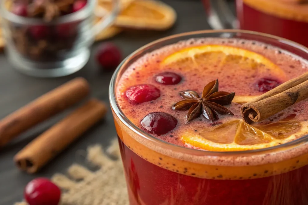 Start by heating unsweetened cranberry juice with freshly squeezed orange juice in a saucepan. Add cinnamon sticks and a few cloves, letting the mixture simmer slowly so the tart and citrus notes balance beautifully. Once hot, pour into mugs and garnish with orange slices or fresh cranberries for a festive touch.