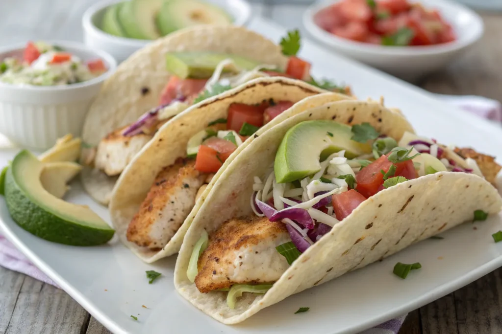 Season white fish with chili powder, cumin, paprika, garlic, and lime. Bake until flaky, then stuff into tortillas with cabbage slaw and yogurt-lime dressing. A lighter, healthier taco option without frying.