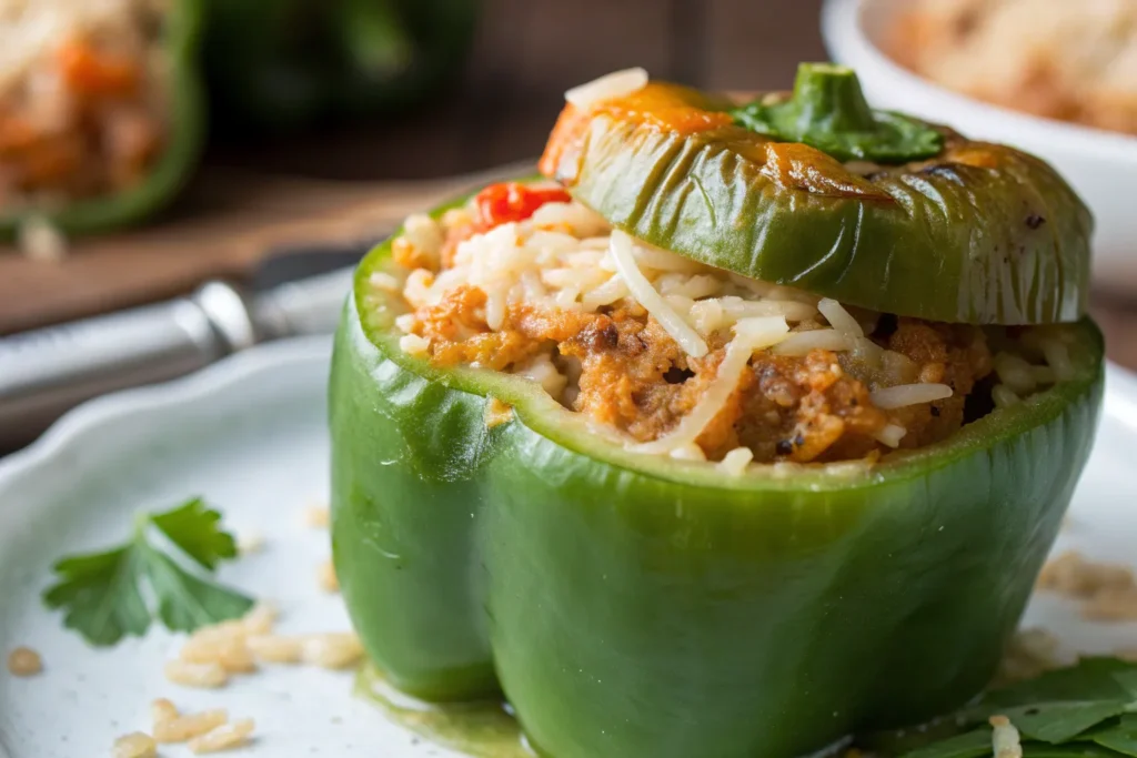 Bell peppers filled with seasoned ground beef, rice, and cheese make a warm, filling dish that’s perfect for a cozy weeknight dinner.