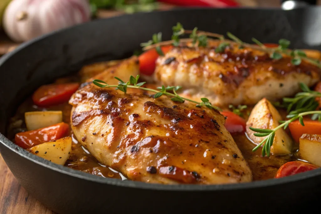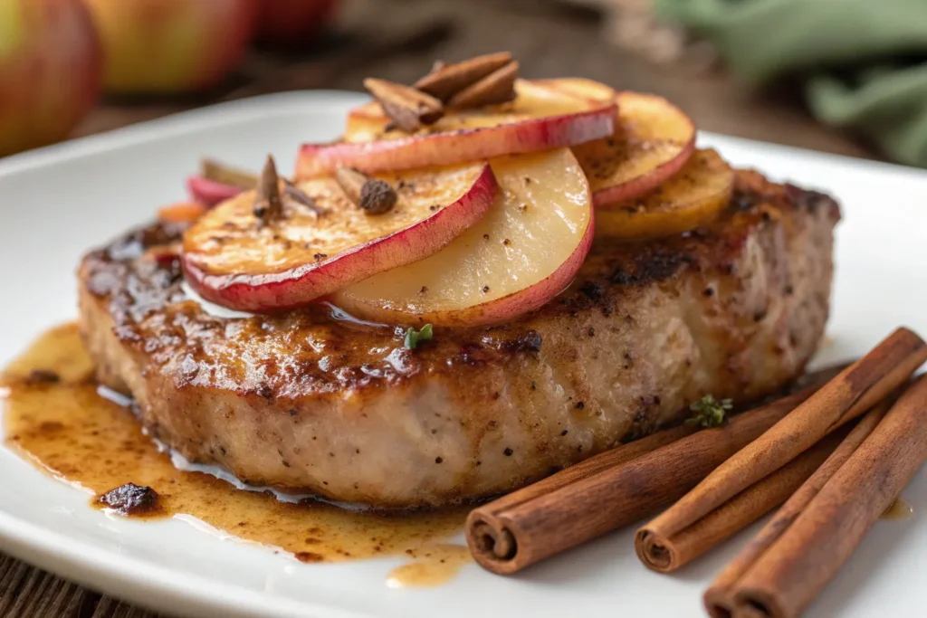 Juicy pork chops are seared and simmered in a sweet-tangy apple cider sauce, capturing the essence of fall on a plate.