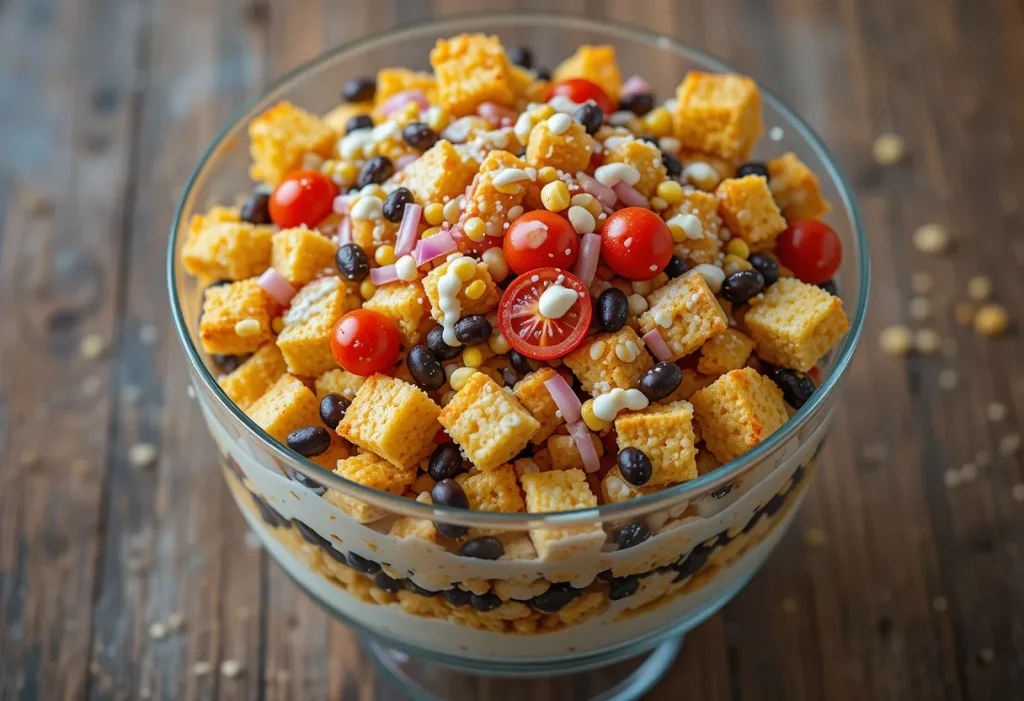 Layers of cornbread, beans, corn, and creamy dressing create a colorful, hearty salad perfect for sharing.
