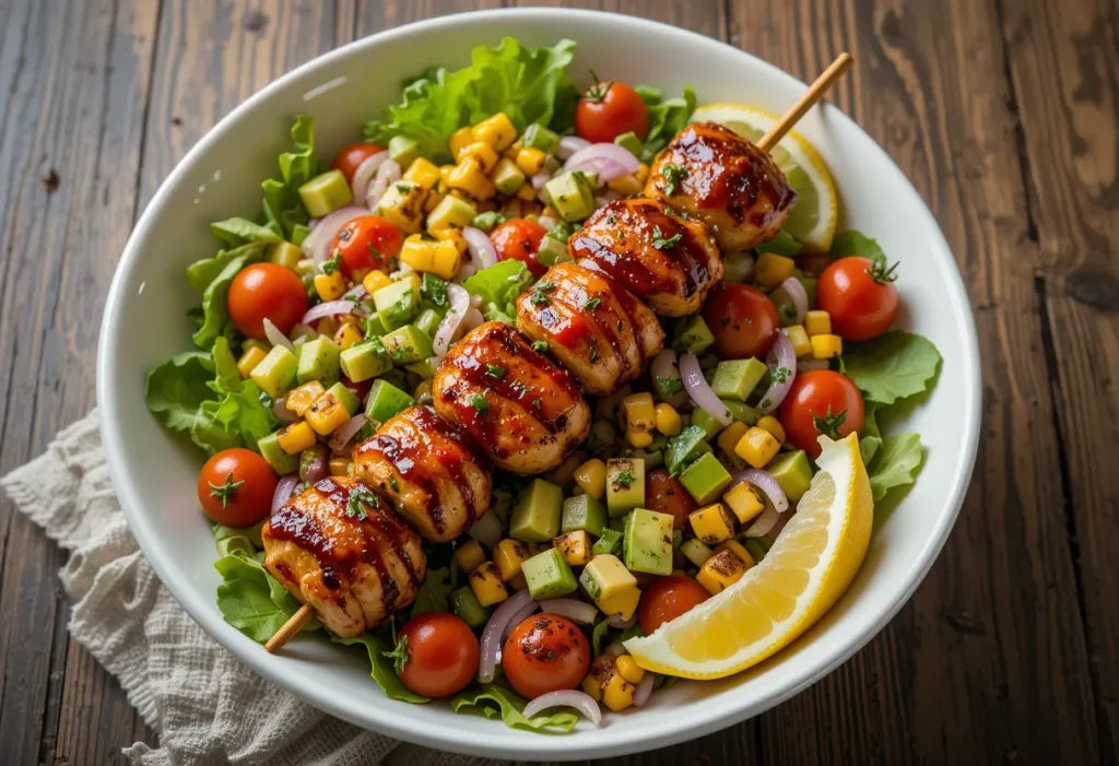 Grilled chicken skewers served over fresh greens with BBQ drizzle—a smoky twist on salad.