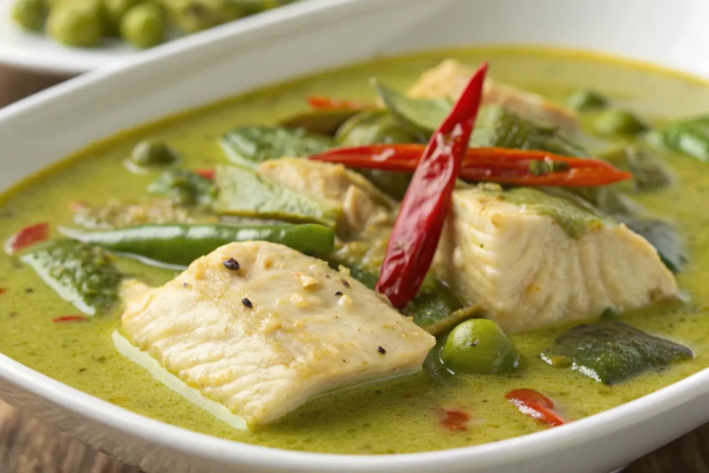 Simmer fish in a green curry sauce made with coconut milk, green curry paste, lime leaves, and vegetables. Serve with rice noodles or steamed jasmine rice.