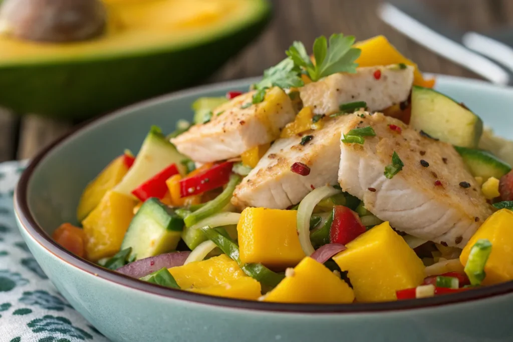 Poach white fish lightly, flake it, and toss with fresh mango, red onion, chili, and lime juice. This refreshing salad balances sweet, sour, and spicy flavors perfectly.