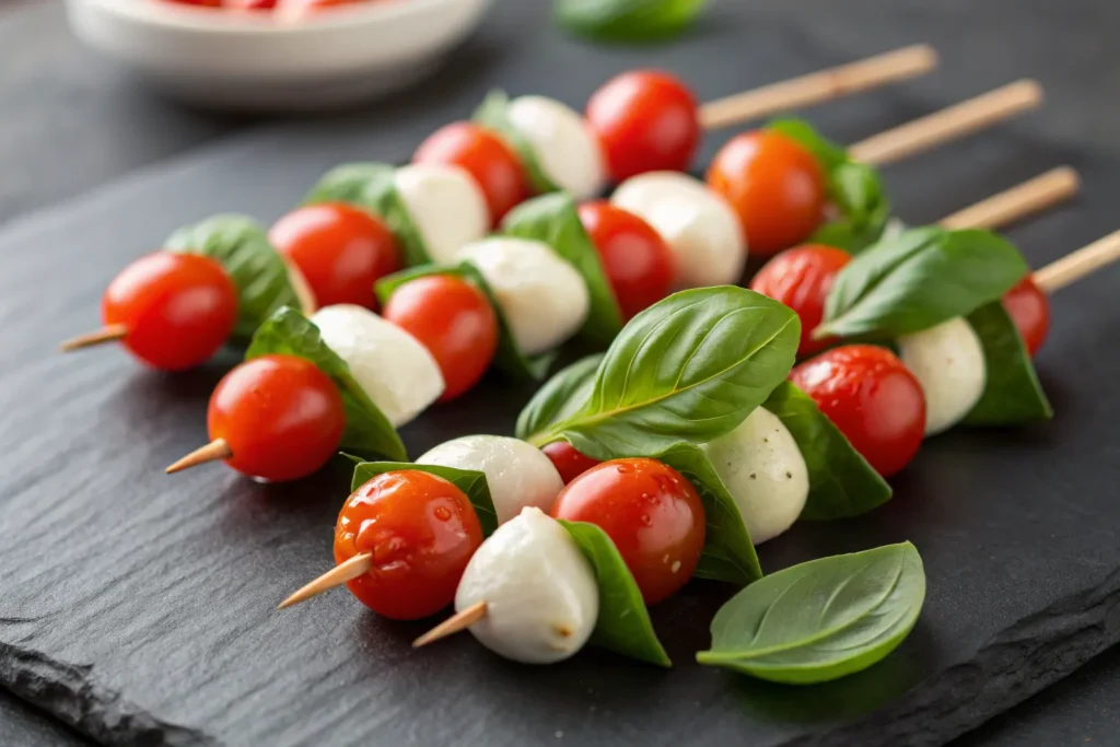 Cherry tomatoes, mozzarella balls, and basil on skewers with a balsamic drizzle, fun for little hands.