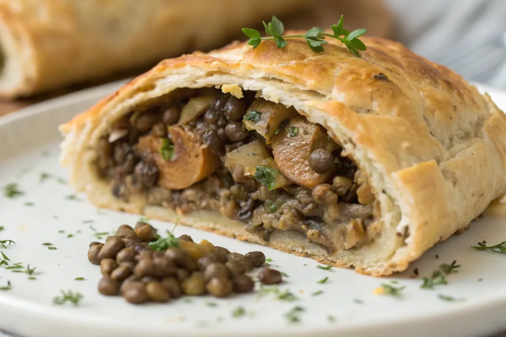 A plant-based twist on the classic beef Wellington: hearty lentils and mushrooms wrapped in puff pastry for a show-stopping dish.