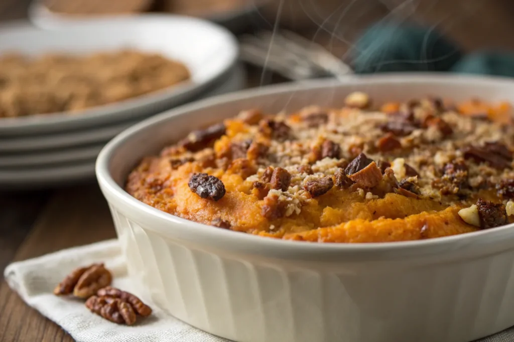 Use mashed sweet potatoes with a pecan-oat crumble topping; less sugar, still indulgent.