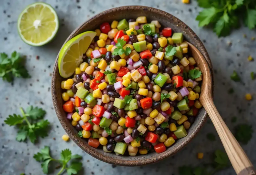 - Mix the base: In a large bowl, combine black beans, corn, cherry tomatoes, red onion, and cilantro.