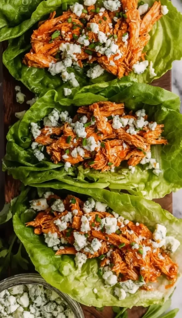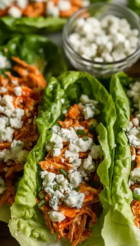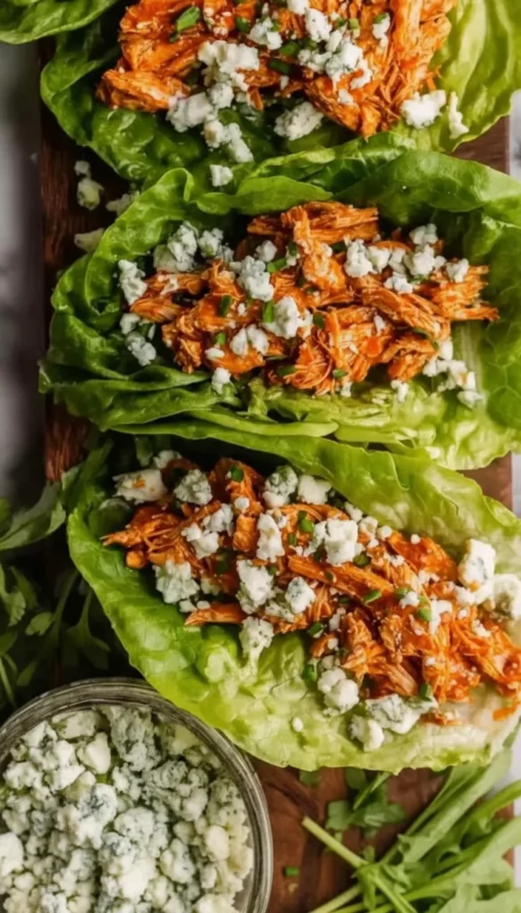 Buffalo chicken lettuce wraps filled with spicy shredded chicken, blue cheese crumbles, and crisp vegetables