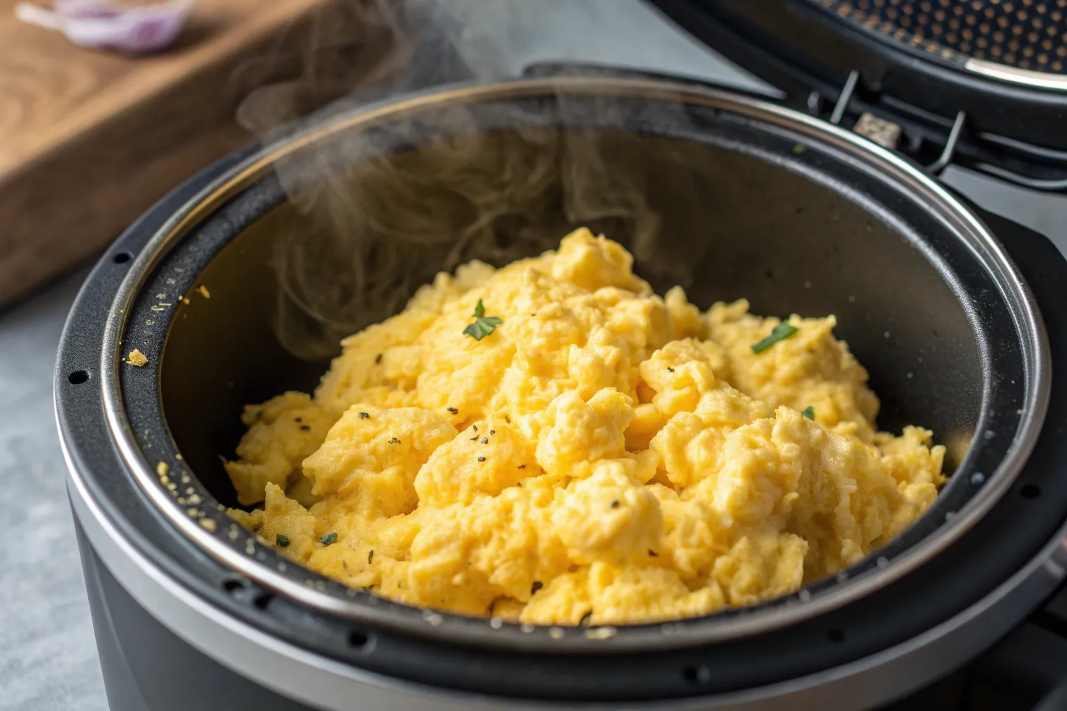 Store leftover scrambled eggs in an airtight container for up to three days. Reheat gently in the microwave in 15–20 second intervals to avoid drying them out. You can also reheat them in the air fryer at a low temperature for a few minutes.