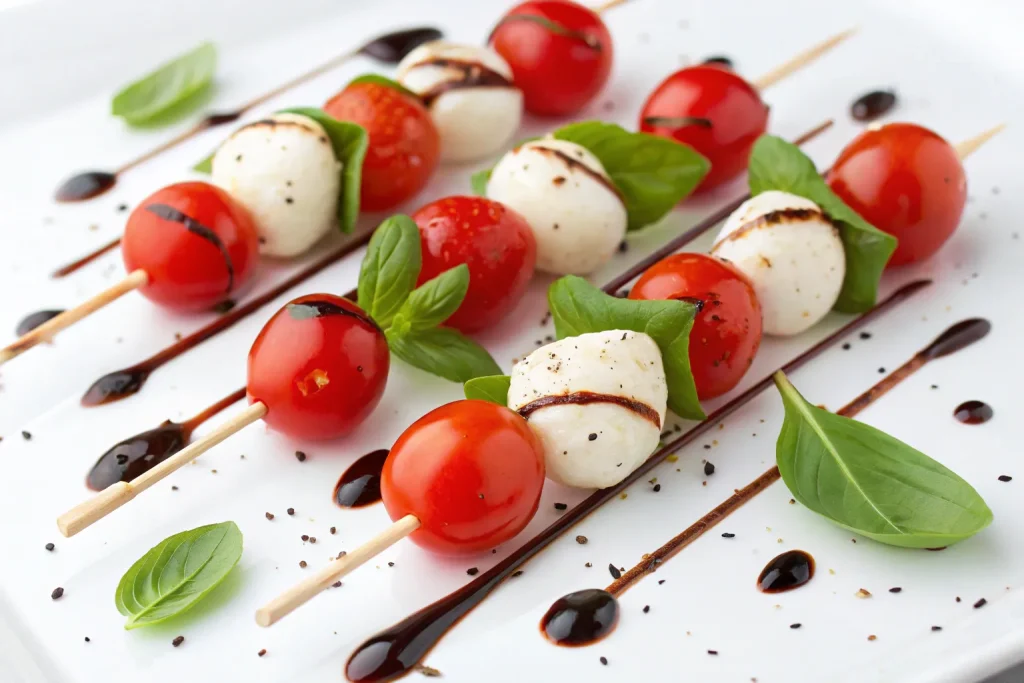 Fresh, colorful, and simple to assemble, mini Caprese skewers bring together juicy cherry tomatoes, mozzarella balls, and basil leaves. Drizzled with balsamic glaze, they’re a refreshing bite that adds brightness to the appetizer table.
