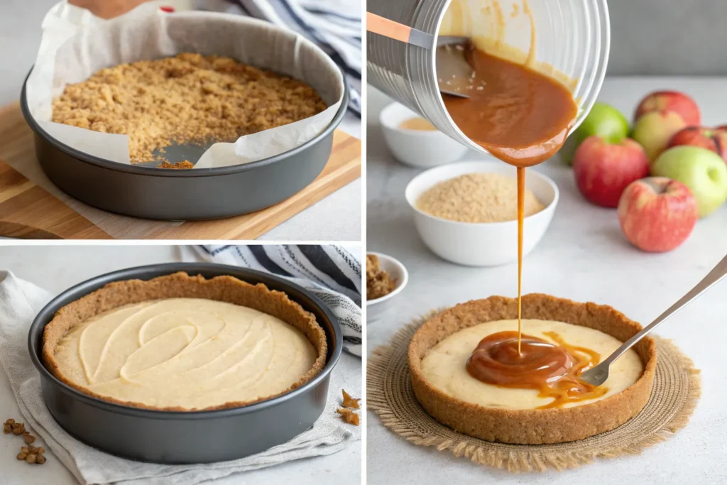 - Prepare the apples: In a small skillet, cook apples with butter, brown sugar, and cinnamon for about 5 minutes until slightly soft. Spoon the apple mixture evenly over the cheesecake batter.