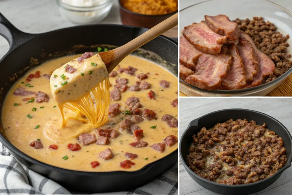 Add cooked ground beef and crumbled bacon to the cheese sauce. Stir until well combined. - Finish and Serve: