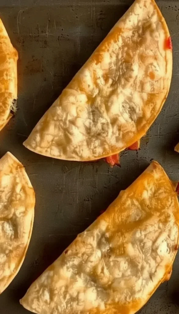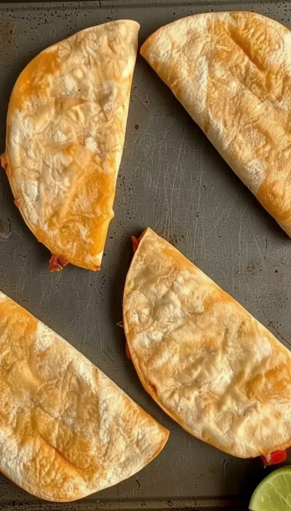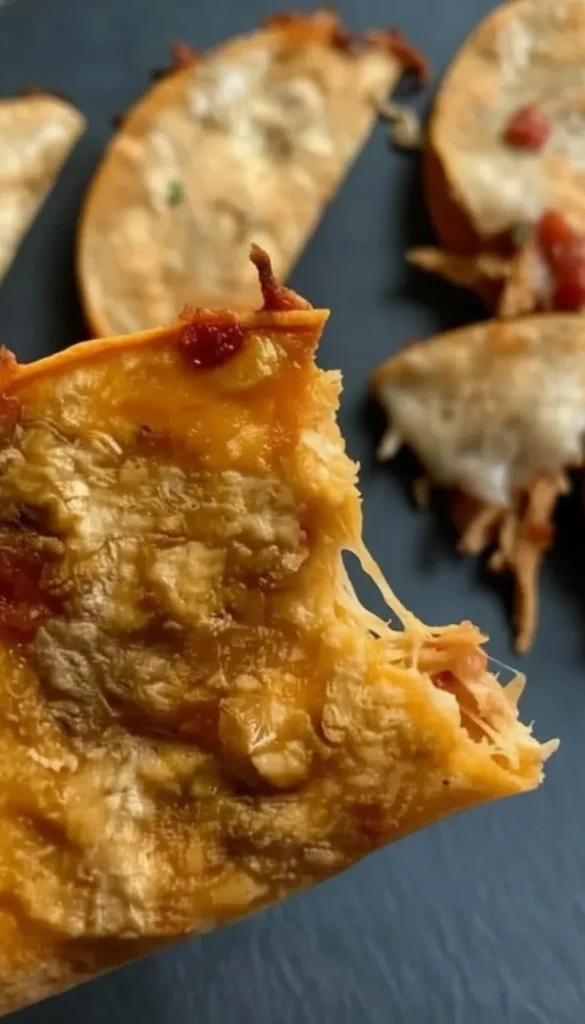 Crispy baked tacos with melted cheese and shredded chicken served on a baking tray.