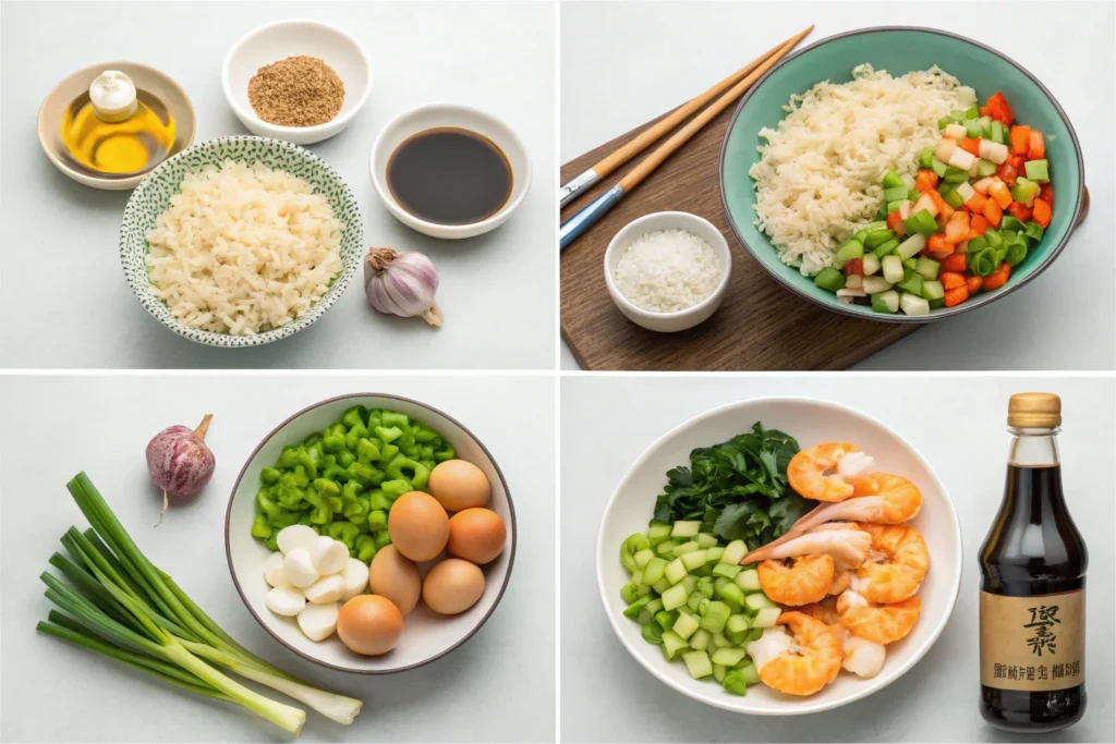 - Cooked rice (3–4 cups): Day-old jasmine or long-grain rice works best