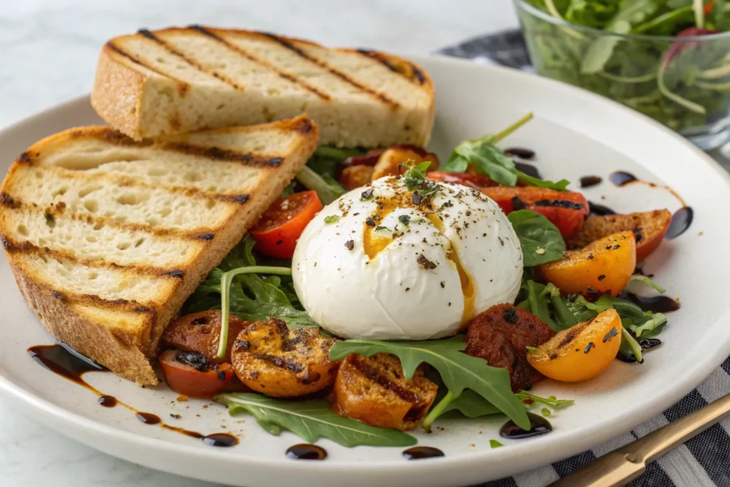 Serve burrata with grilled bread or slices of garlic toast to balance the creamy texture with warmth and crunch. It also pairs beautifully with roasted vegetables or a light green salad for a more complete meal. A thin drizzle of balsamic glaze adds a gentle sweetness and tang that complements the creaminess of the cheese.