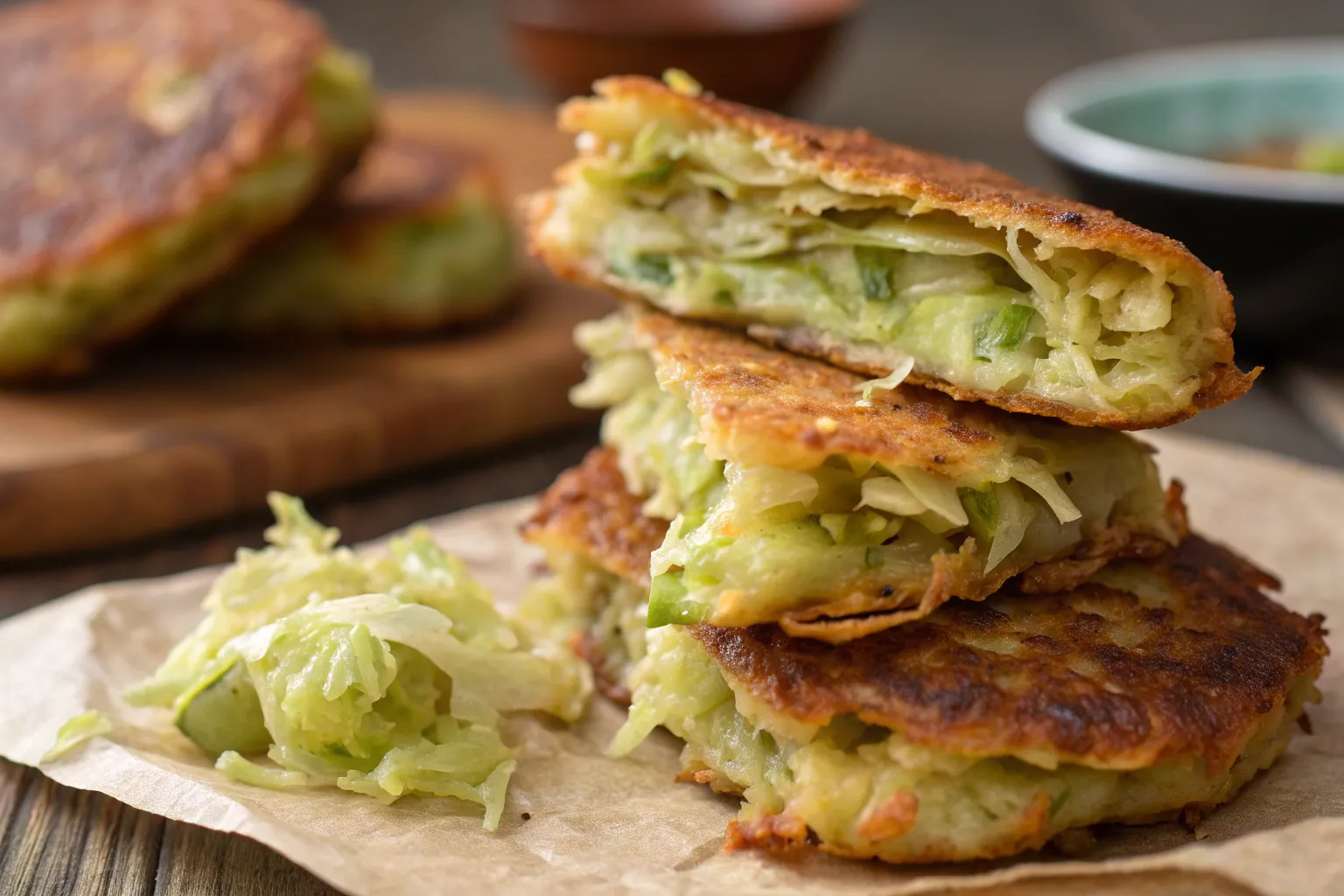 Cabbage pancakes, also known as cabbage fritters, are savory patties made from finely shredded cabbage mixed with eggs, flour or a binding ingredient, and seasonings. They are pan-fried, baked, or air-fried until crispy on the outside and tender inside.