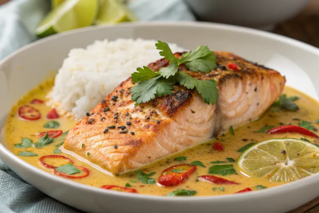 Sear salmon skin-side down for maximum flavor and texture. Use fresh ginger and garlic for the most aromatic sauce. Add curry paste gradually to control spice levels.