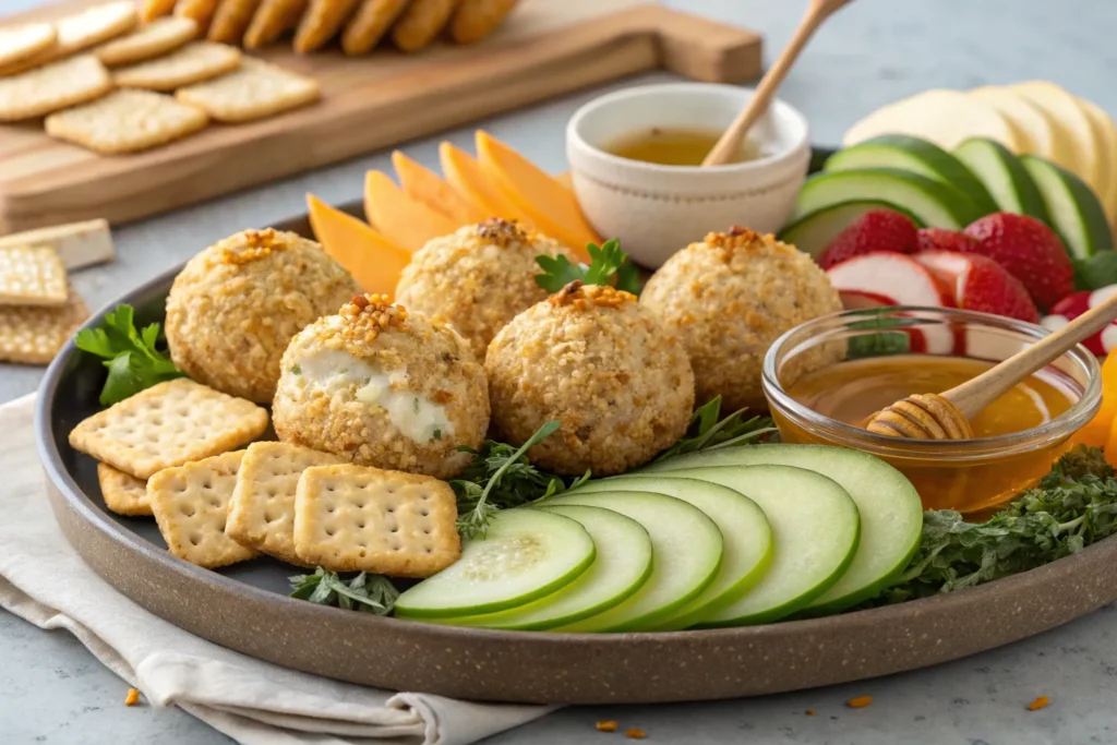 Serve cheese ball bites on a platter with crackers, sliced vegetables, or warm bread. They also pair well with fruit slices or a light honey drizzle for contrast.