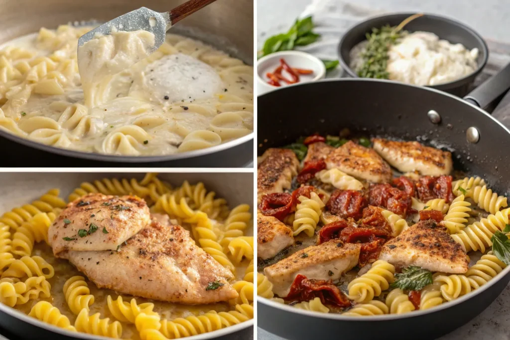- Bring it together – Return chicken to the skillet, add the cooked pasta, Parmesan, and mozzarella. Stir until everything is coated in creamy, cheesy goodness.