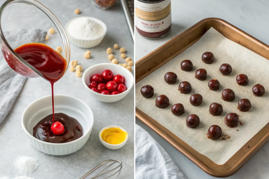 - Place the cherry balls on a tray lined with parchment paper and refrigerate for at least 30 minutes to firm up.
