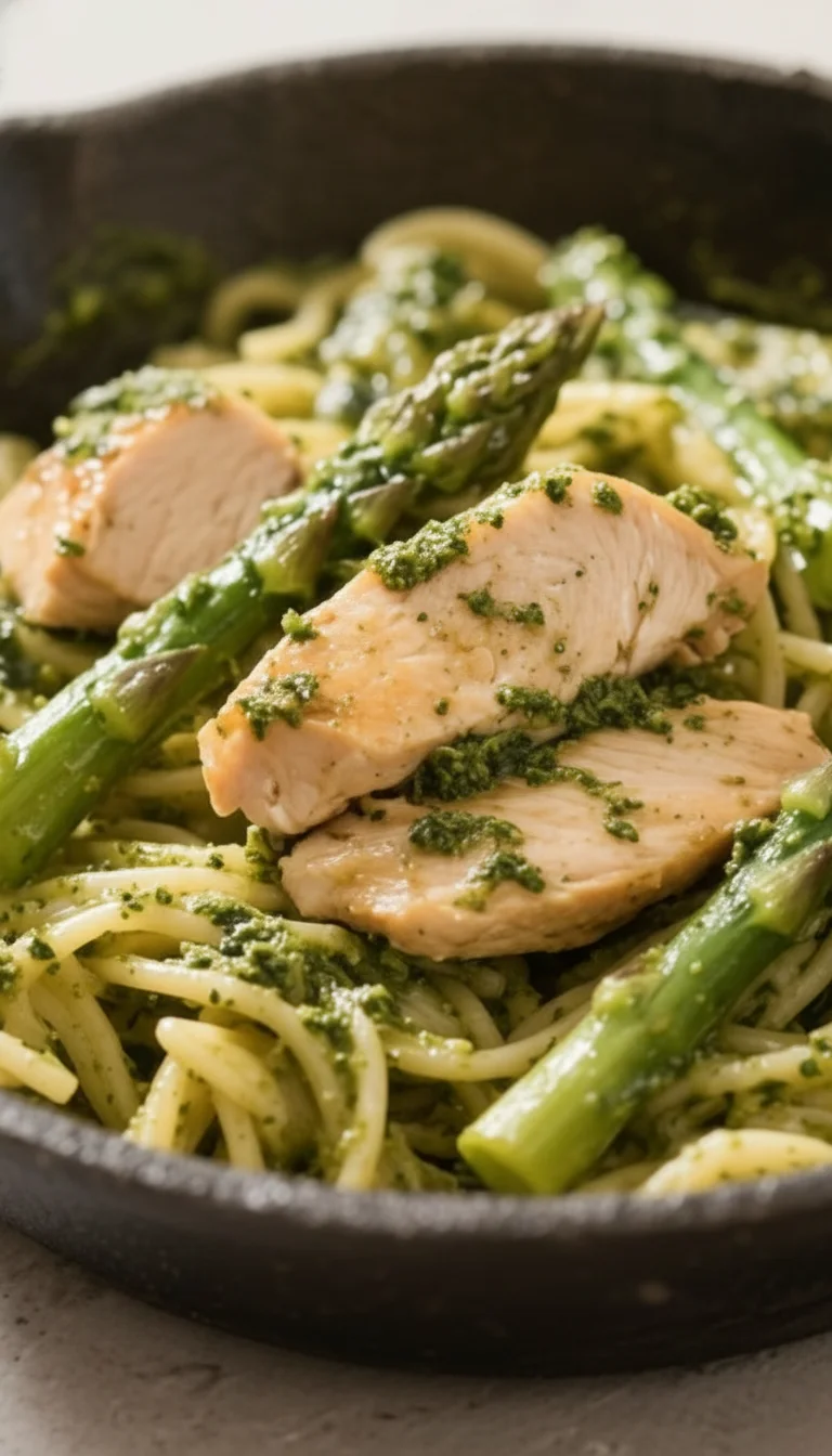 This is the kind of weeknight dinner that feels special without any fuss. Tender bites of chicken, crisp-tender asparagus, and al dente pasta all come together in one skillet, glossy with a bright, garlicky pesto. It smell amazing, cooks fast, and tastes like spring in a bowl.