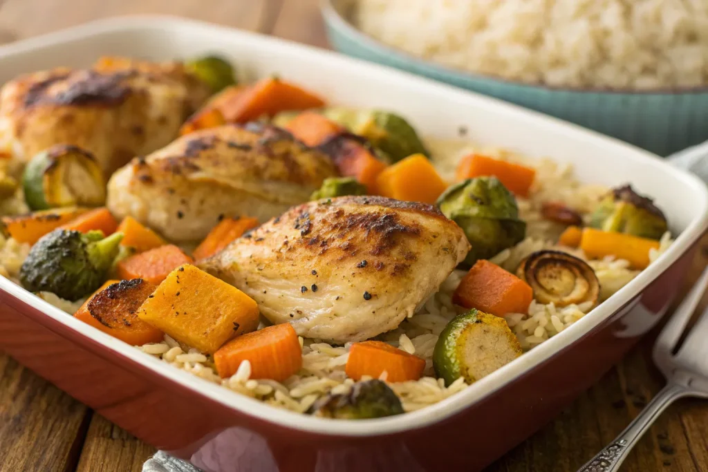 This Chicken & Rice Bake is a wholesome, balanced meal that’s both flavorful and fuss-free. The fall vegetables bring sweetness and texture, while the chicken and rice provide protein and substance. It’s a complete meal in one dish, minimizing cleanup while maximizing comfort. Perfect for family dinners, meal prep, or even a casual dinner party.