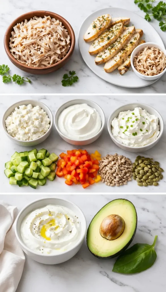 Here’s the deal: this salad is ridiculously simple but somehow still feels gourmet. It’s basically chicken + cottage cheese + a few fun extras, shaken—not stirred (but really, you’ll be mixing it).