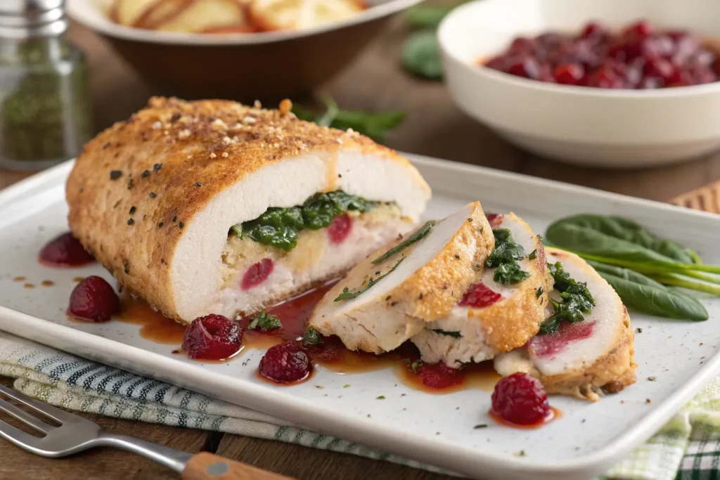 One of the best parts of this recipe is its flexibility. If brie isn’t available, camembert or cream cheese make excellent substitutes with similar creaminess. You can swap out cranberry sauce for fig jam, raspberry preserves, or even apricot glaze for a different flavor twist. When it comes to greens, spinach can easily be replaced with kale, arugula, or baby Swiss chard depending on what’s in season. For a lighter or vegetarian version, replace the chicken with turkey cutlets or even stuffed portobello mushrooms for a satisfying alternative.