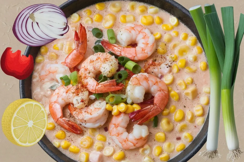 Begin by sautéing onion, celery, and bell pepper in butter until softened. Add garlic and tomato paste, cooking until aromatic. Sprinkle in flour if using for thickening, then stir in Cajun seasoning and paprika to bloom the spices. Pour in the broth and bring to a gentle simmer. Add corn and cook until tender. Stir in the cream to create the bisque’s silky base. Add shrimp and simmer just until they turn pink and opaque. Finish with lemon juice and green onions before serving.