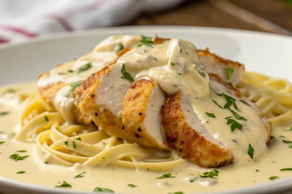 - Combine: Toss pasta in the Alfredo sauce, top with chicken slices, and garnish with parsley.