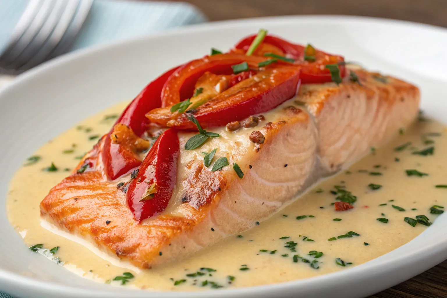 This dish is a showstopper that requires minimal effort but delivers maximum flavor. The roasted red pepper cream sauce adds a luscious, slightly sweet contrast to the savory salmon, while garlic, Parmesan, and herbs tie everything together. Whether you’re cooking for guests or just want to elevate your weeknight meal, this recipe makes every bite feel special.