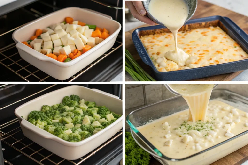 To make the casserole, start by preheating the oven and lightly greasing a baking dish. The vegetables are chopped and lightly cooked to soften them before being layered into the dish. A creamy sauce is prepared on the stovetop by making a roux, then slowly adding milk or cream until smooth and thickened. The sauce is poured over the vegetables, gently mixed, topped with cheese if desired, and baked until bubbling and golden on top.