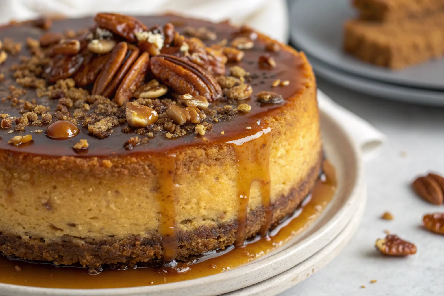 - Garnish & Serve: Drizzle caramel over the top, sprinkle extra pecans, and slice to serve.