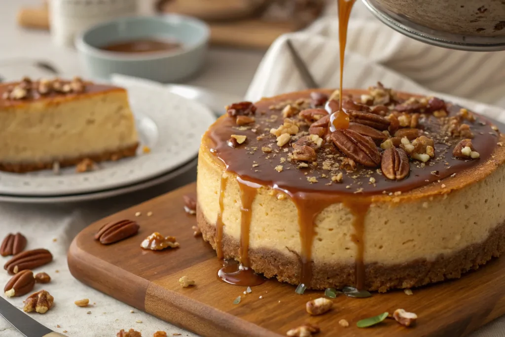 - Garnish & Serve: Drizzle caramel over the top, sprinkle extra pecans, and slice to serve.