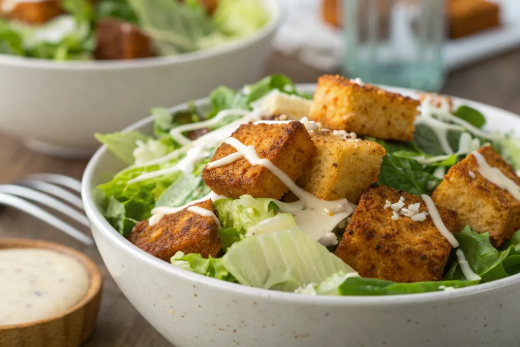 Preheat the oven to 400°F (200°C) or heat an air fryer. Toss cubed tofu in olive oil, garlic powder, salt, and pepper, then bake or air-fry until crispy. Once crispy, toss the tofu in buffalo sauce until evenly coated. In a large bowl, combine chopped romaine lettuce, croutons, and vegan Caesar dressing. Top with buffalo tofu and sprinkle with vegan parmesan or nutritional yeast if desired. Serve immediately while the tofu is warm and crisp.