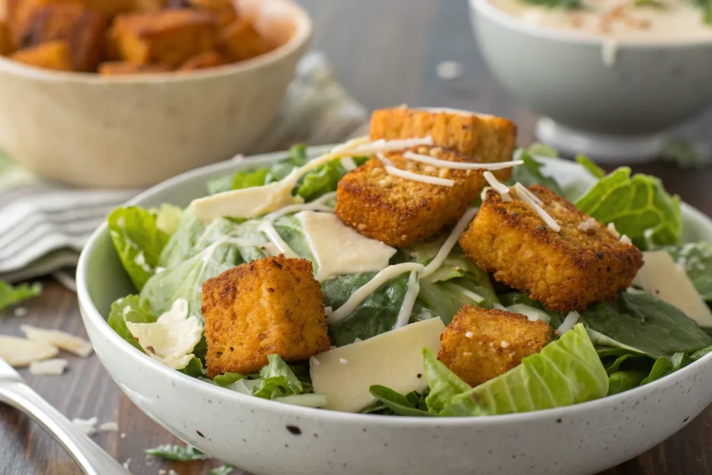Caesar salad originated in Mexico in the 1920s but became popular worldwide, typically with anchovies and Parmesan cheese. This vegan version replaces animal-based ingredients with tofu and plant-based dressing, modernizing the classic while maintaining its signature flavors.