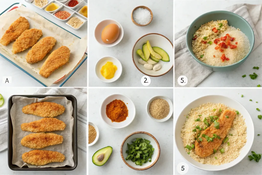 To prepare the crispy fish, start by cutting your fillets into bite-sized strips or chunks so they cook quickly and evenly. Set up a breading station with flour in one bowl, beaten eggs in another, and a mix of panko, garlic powder, paprika, chili powder, salt, and pepper in the final bowl. Coat each piece of fish first in flour, then dip it into the eggs, and finally press it firmly into the panko mixture. Arrange the coated pieces on a sheet pan. Bake at 425°F for 12–15 minutes, or air fry at 400°F for 8–10 minutes until golden and crisp. While the fish cooks, whisk together the sauce ingredients and prepare your bowl components.