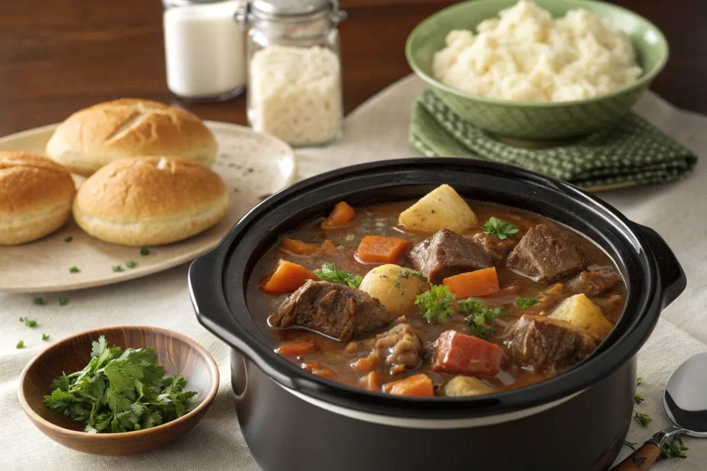Crockpot beef stew is best served hot and pairs well with crusty bread, dinner rolls, or buttered biscuits. It can also be served over mashed potatoes or rice for an extra hearty meal. Garnishing with fresh parsley adds color and freshness.