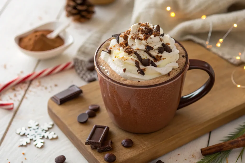 - Serve: Pour into mugs, top with whipped cream, and garnish with chocolate shavings or a light dusting of cocoa powder. Enjoy immediately.
