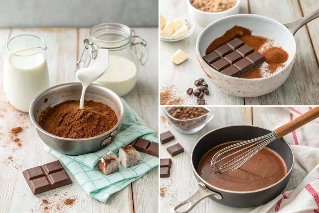 - Add Chocolate and Cocoa: Reduce heat to low, add chocolate chips and cocoa powder. Stir constantly until fully melted and smooth.