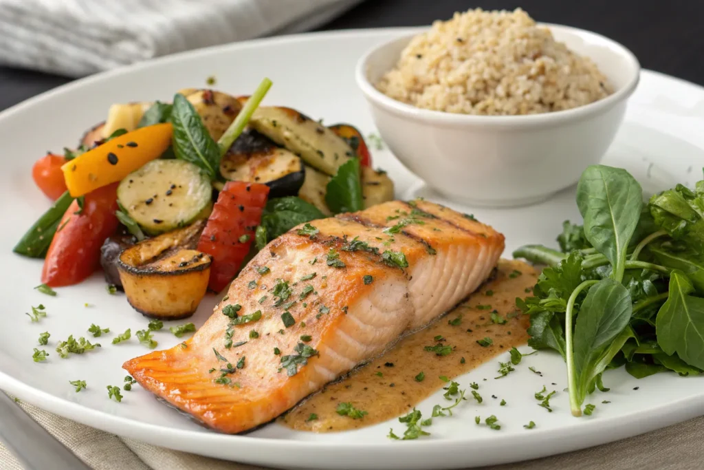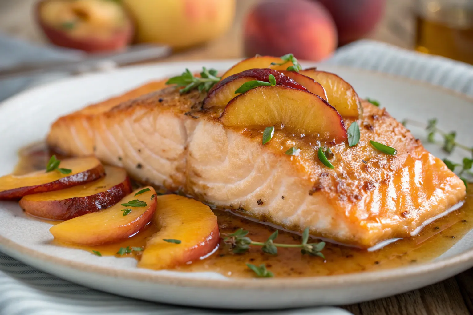 Salmon is an excellent source of heart-healthy omega-3 fatty acids and high-quality protein. Peaches add natural sweetness, fiber, and vitamins, while the bourbon glaze enhances flavor without adding excessive calories. This dish is nutrient-dense yet light, making it suitable for balanced meals.