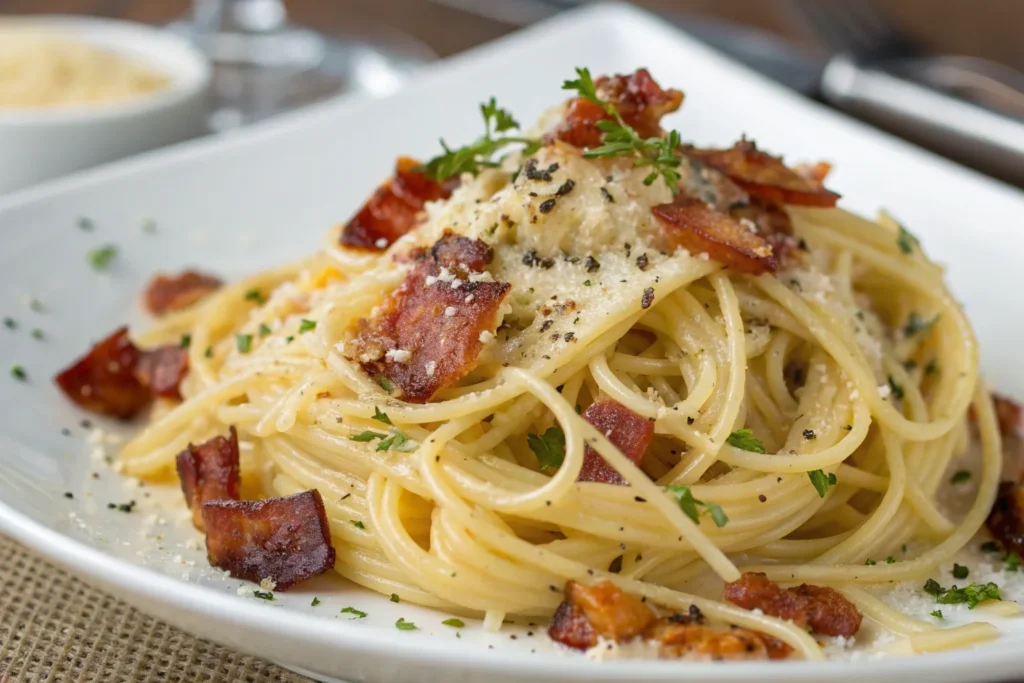 Spaghetti carbonara is a classic pasta dish that’s ready in under 20 minutes. Cooked spaghetti is tossed with eggs, Parmesan cheese, crispy bacon, and black pepper to create a creamy, flavorful sauce without any cream. This dish is loved by both kids and adults and makes for a quick, satisfying dinner that feels special without any fuss.
