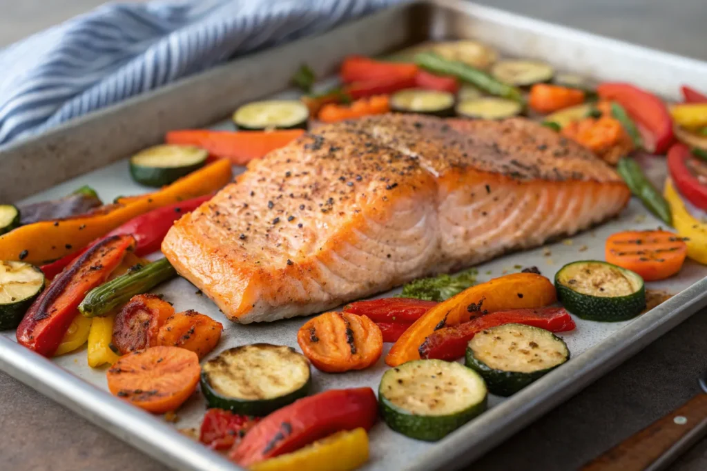 Sheet pan salmon with roasted veggies is a nutritious and effortless dinner. Salmon fillets are baked alongside broccoli, bell peppers, and baby potatoes, absorbing the flavors of olive oil, garlic, and herbs. This all-in-one meal is not only delicious but also saves time on washing dishes, making it perfect for a healthy weeknight dinner.