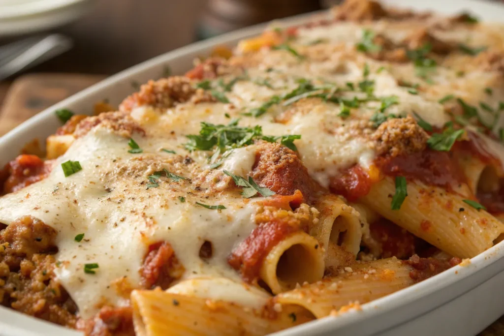 Baked ziti is a comforting and filling dinner that feeds a crowd. Cooked pasta is combined with marinara sauce, ricotta, and mozzarella cheese, then baked until golden and bubbly. This hearty dish is perfect for family dinners, and you can easily add vegetables like spinach or mushrooms for extra nutrition.